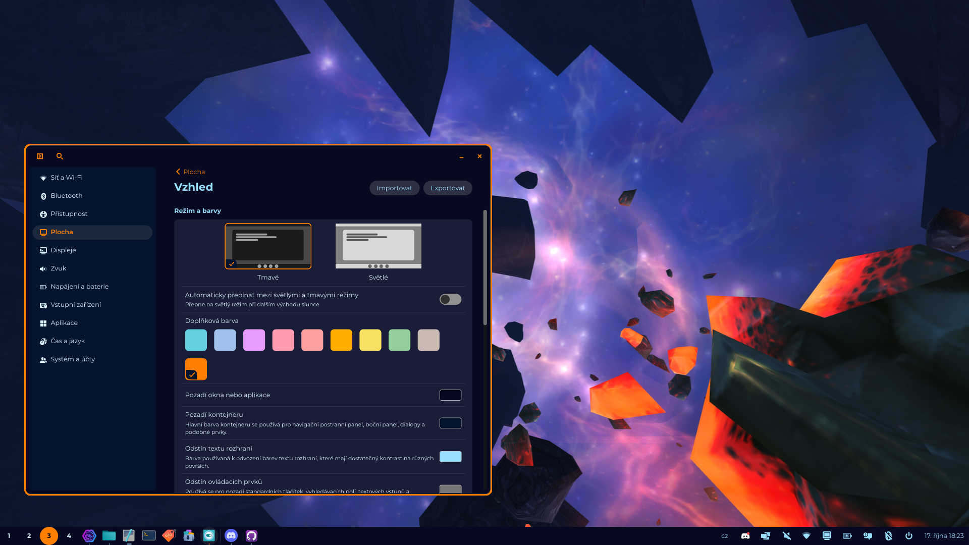 Mám tady vlastní COSMIC téma, nástroj na přepínání témat a layoutů, a to je tak vše čím se to liší od normální COSMIC instalace.