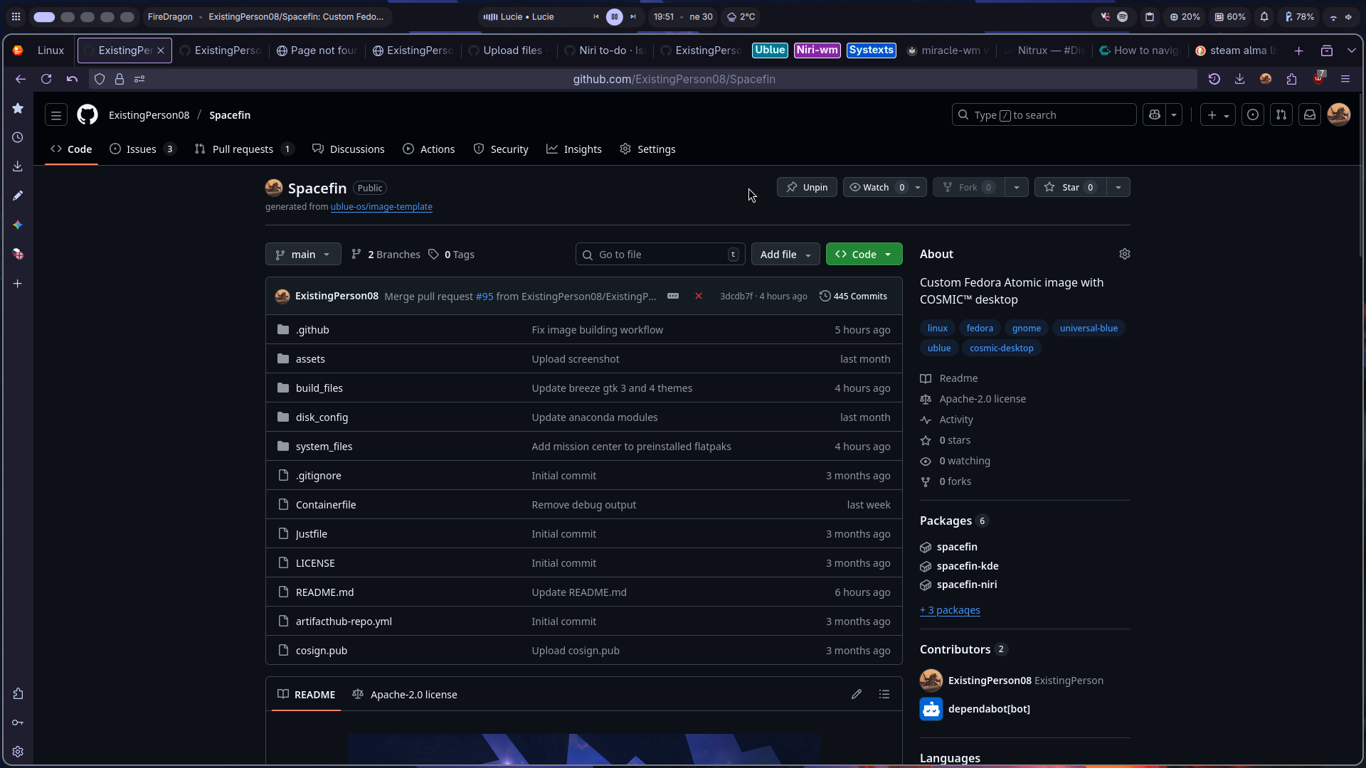 Tady je předkonfigurovaný Niri nastavení s Dank Material Shell, vlastním upraveným config souborem. Nastavený je taky odemykání otiskem prstu. Kromě DMS jsou v obrazu taky navíc užitečné balíčky a balíčky pro dělání vlastní konfigurace bez DMS.